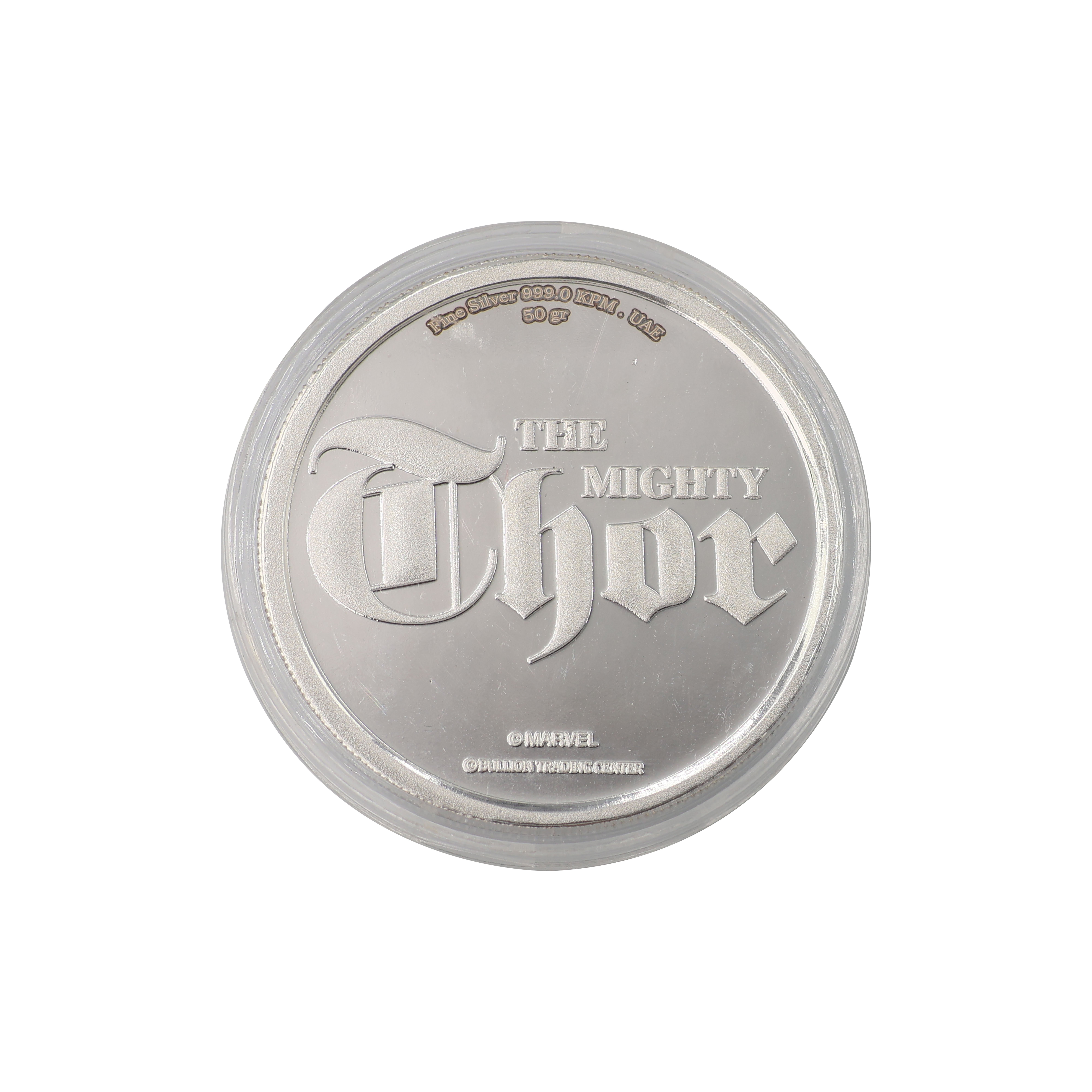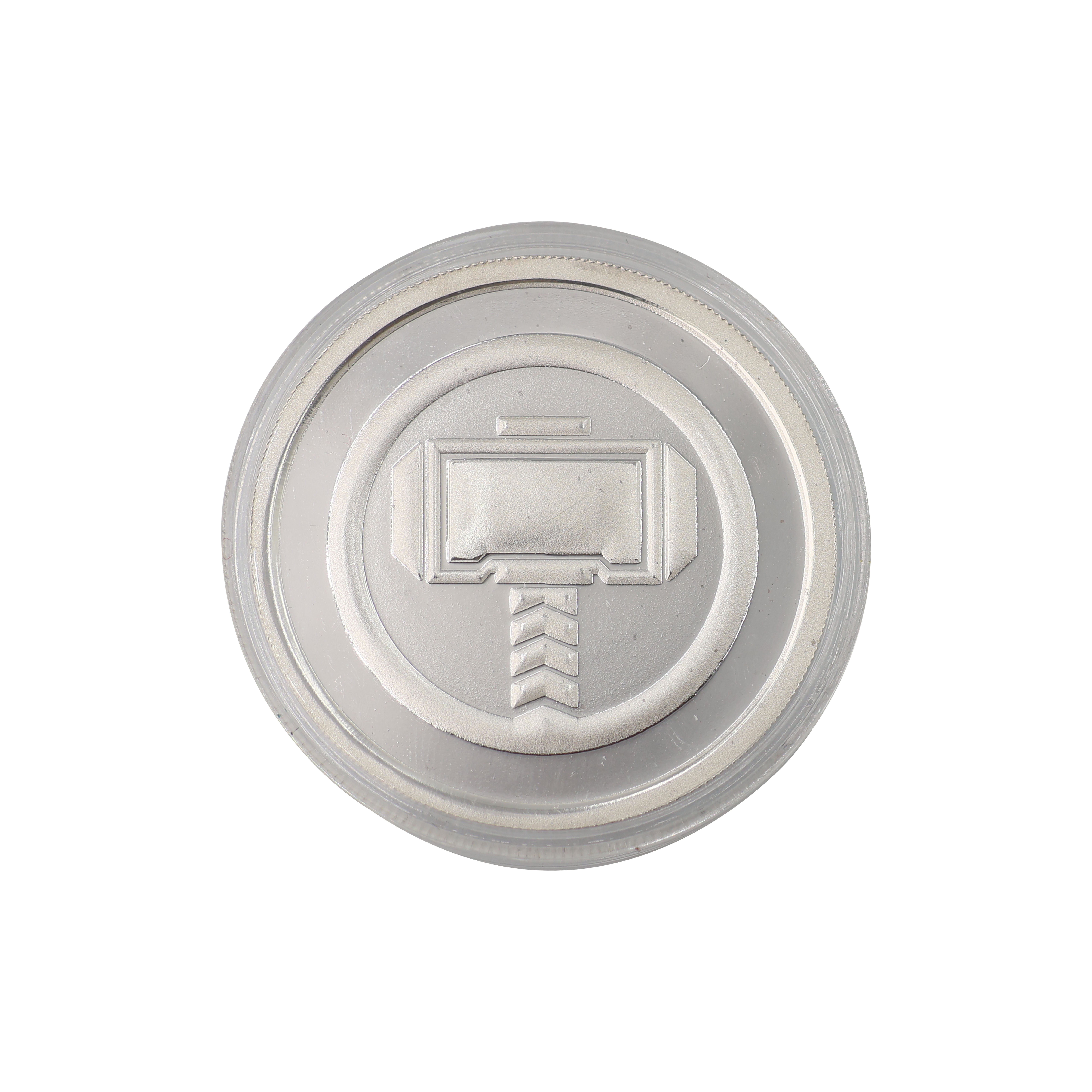 جنيه فضة مطرقة ثُور عيار 999 بي تي سي BTC بوزن 50 غرام. جنيه الفضة المفضل للأطفال، بتصميم مطرقة ثُورالذي هو بطل خارق وشخصية خيالية، من سلاسل القصص المصورة التي تصدرها مارفل كومكس، وشخصيته مأخوذة عن الشخصية التي تحمل نفس الاسم في الميثولوجيا النوردية، وهي ثور بن أودين، وتوصف الشخصية برجل يلبس درعا في سائر جسده إلا رأسه، ويحمل مطرقة تكمن فيها قوته القتالية. 🛡️🦸🏻