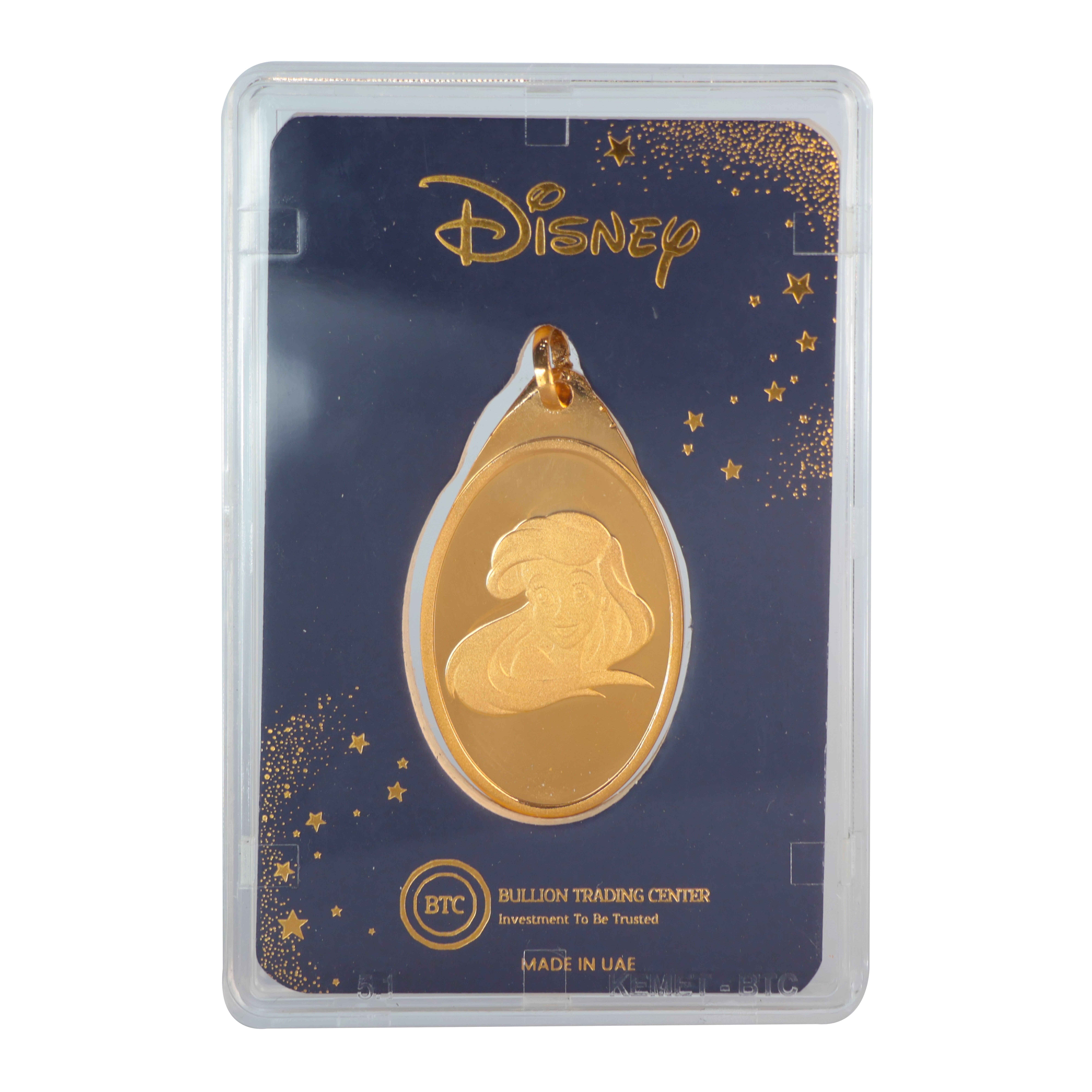 برسمة حورية البحر ديزني بيضاوية الشكل. سبيكة رائعة لتأمين مستقبل أطفالك، صُنعت في الإمارات العربية المتحدة، تحت العلامة التجارية الشهيرة لشركة بي تي سي BTC المصرية. السبيكة مغلفة في بطاقة خاصة بها لضمان عدم تعرضها لأي خدش أو تلف. 💛✨