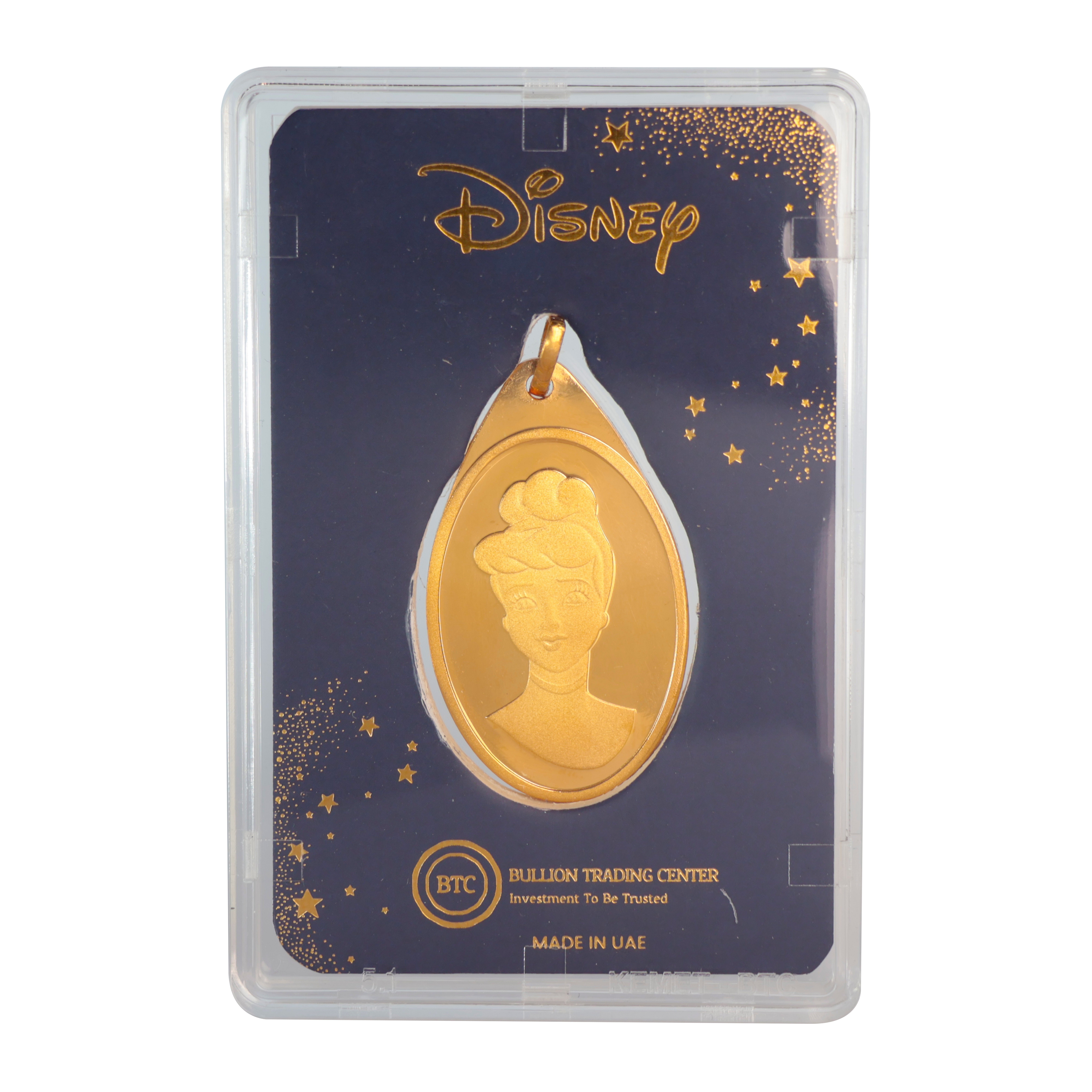 برسمة سندرلا ديزني بيضاوية الشكل. سبيكة رائعة لتأمين مستقبل أطفالك، صُنعت في الإمارات العربية المتحدة، تحت العلامة التجارية الشهيرة لشركة بي تي سي BTC المصرية. السبيكة مغلفة في بطاقة خاصة بها لضمان عدم تعرضها لأي خدش أو تلف. 💛✨