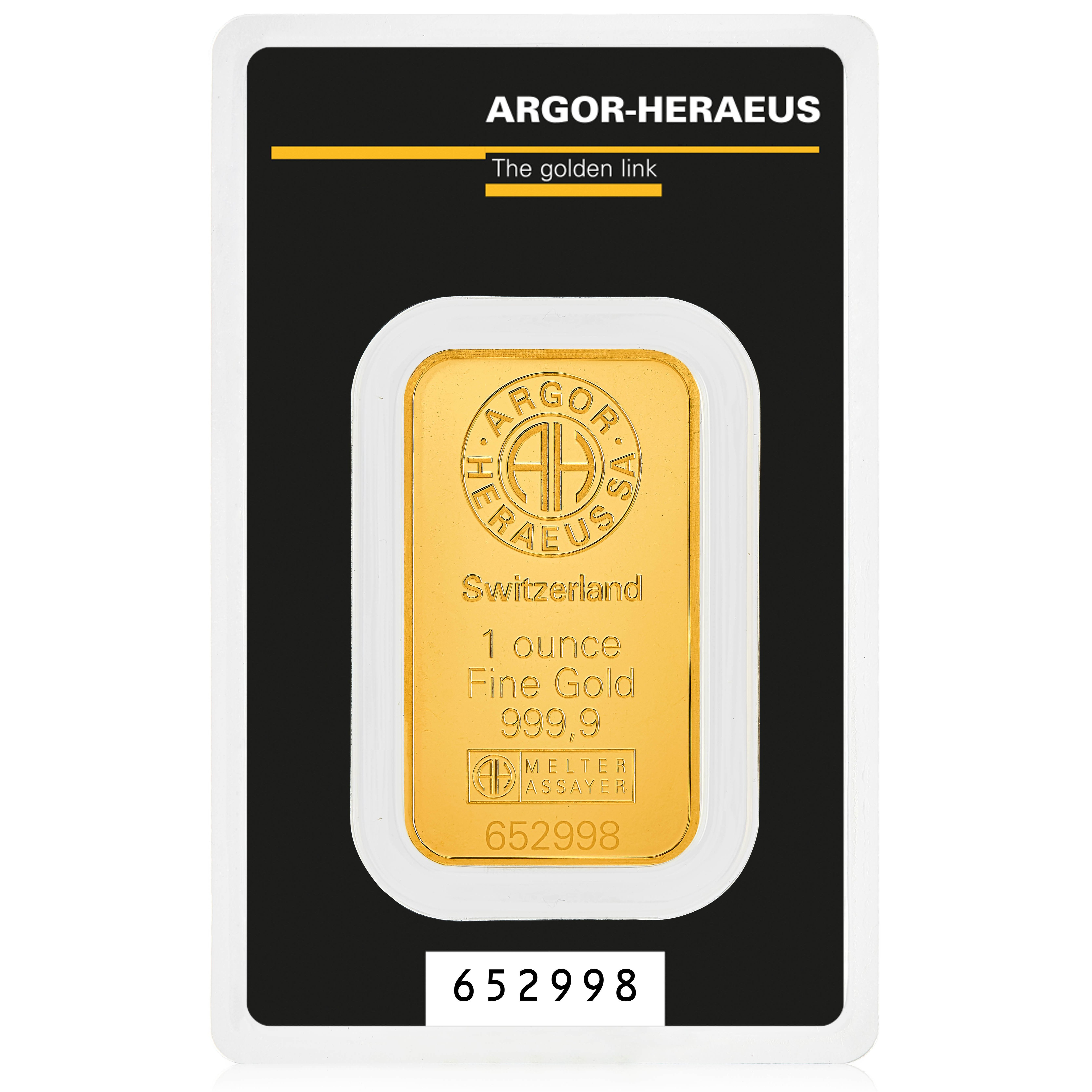 - الوجه الأمامي (Obverse): يحمل الشعار الدائري الأنيق (AH) لشركة "أرغور-هيريوس"، وكلمة "Switzerland"، والوزن (1 ounce)، ودرجة النقاء (Fine Gold 999,9)، وختم الفحص المعتمد، والرقم التسلسلي.
