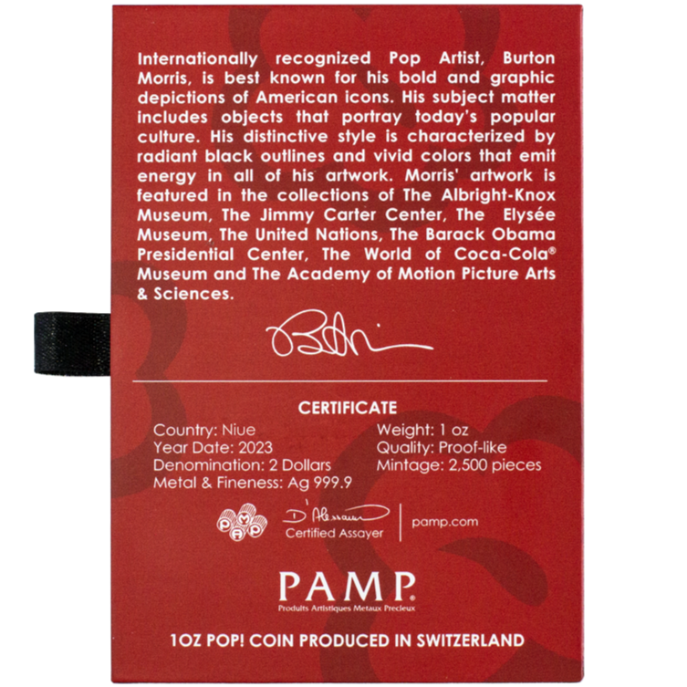 Der seltene Burton Morris Popcorn Design Silver Pumice ist eine der seltensten verfügbaren Silbermünzen und hat eine limitierte Auflage: nur 2.500 Stück weltweit. Mit der höchsten Reinheit von 999,9 eignen sich PAMP Suisse- Produkte dank ihrer hohen Qualität und ihres einzigartigen Designs ideal zum Verschenken, Sparen und Sammeln.