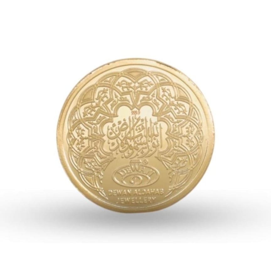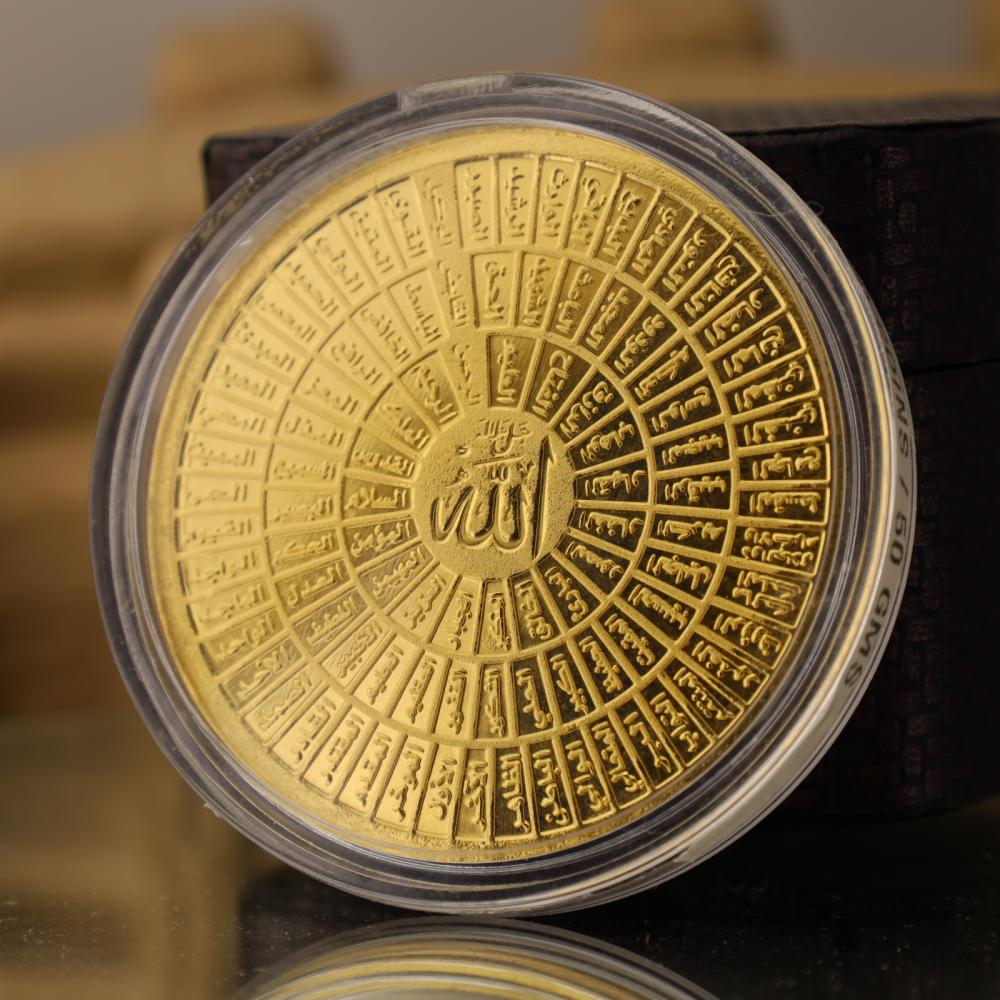 Una moneda de oro producida por Diwan Al-Dhahab, con un distintivo diseño circular grabado con los nombres de Alá. Esta moneda de oro de 24 quilates y 999,9 de pureza es ideal para ahorrar de forma inteligente y segura a largo plazo en Arabia Saudita, o como un regalo sofisticado para diversas ocasiones, como bodas, compromisos, nacimientos, éxitos y cumpleaños.