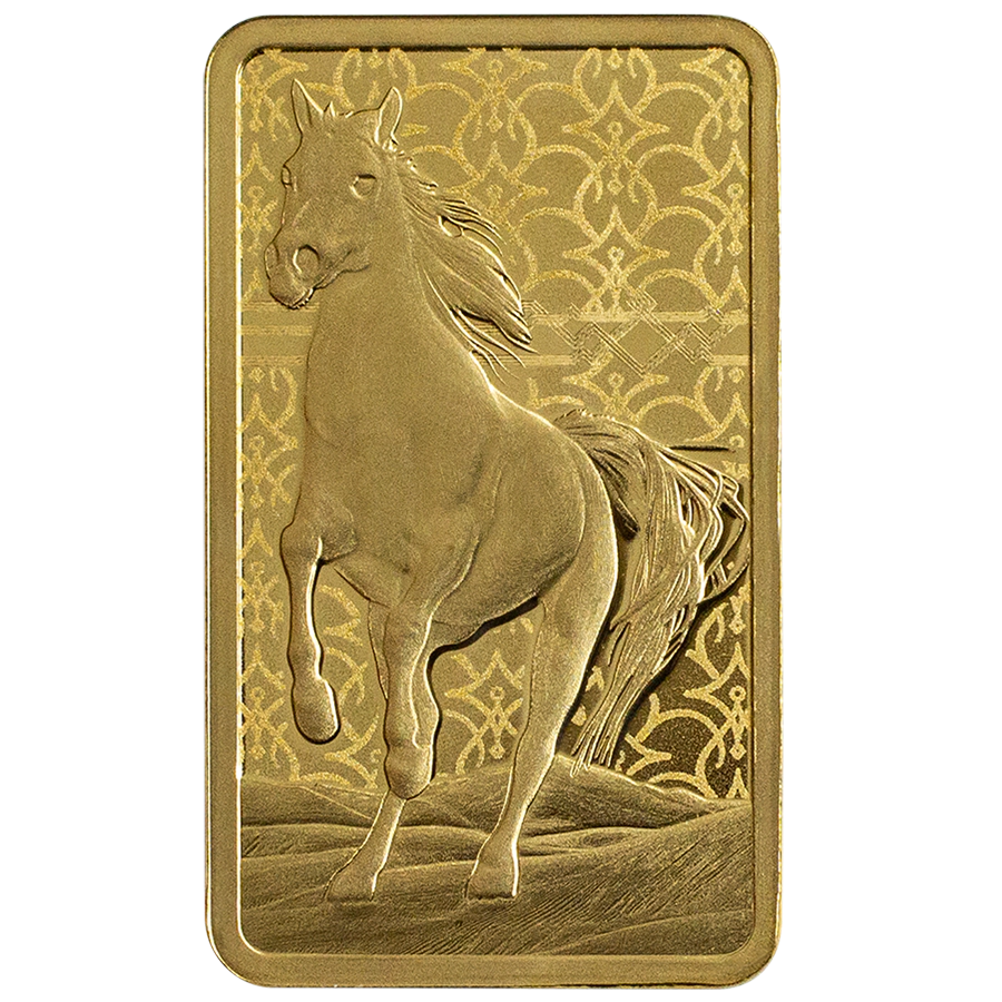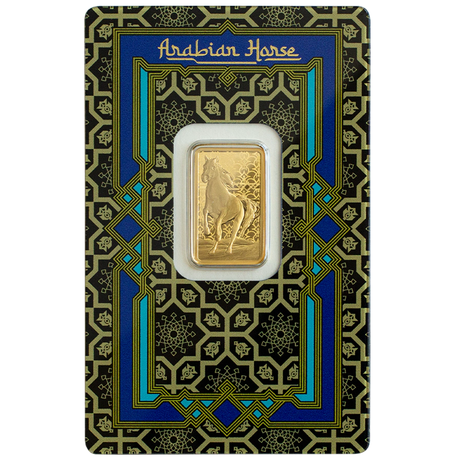 Lingot d'or à pompe PAMP 5 grammes Pureté 24 carats (999,9) avec le motif d'un cheval arabe de race pure. C'est une œuvre d'art distinctive et un merveilleux ajout à tout portefeuille d'épargne. La face avant du lingot affiche un majestueux cheval arabe dans un décor désertique, tandis que le revers contient des informations sur le poids et la pureté ainsi qu'un numéro de série unique. 🐎✨