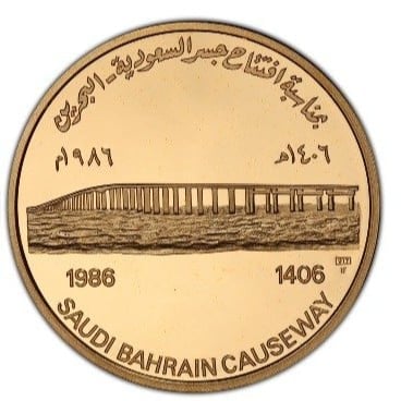 Medaglia d'oro 22 carati commemorativa dell'inaugurazione della passerella tra Arabia Saudita e Bahrein. Una medaglia d'oro commemorativa che incarna la storia delle relazioni del Golfo, emessa per celebrare l'inaugurazione della passerella tra Arabia Saudita e Bahrein nel 1986 d.C. (1406 AH).