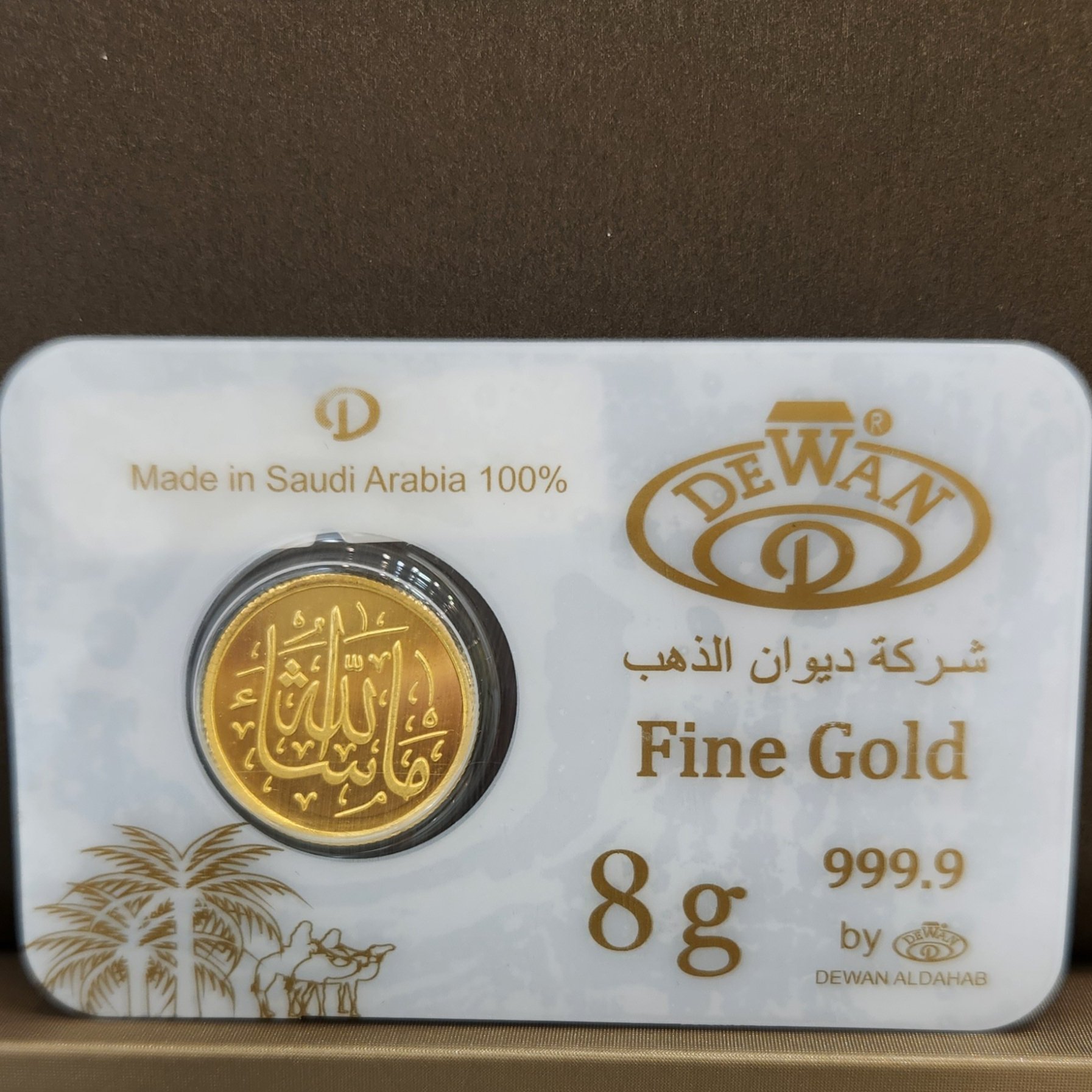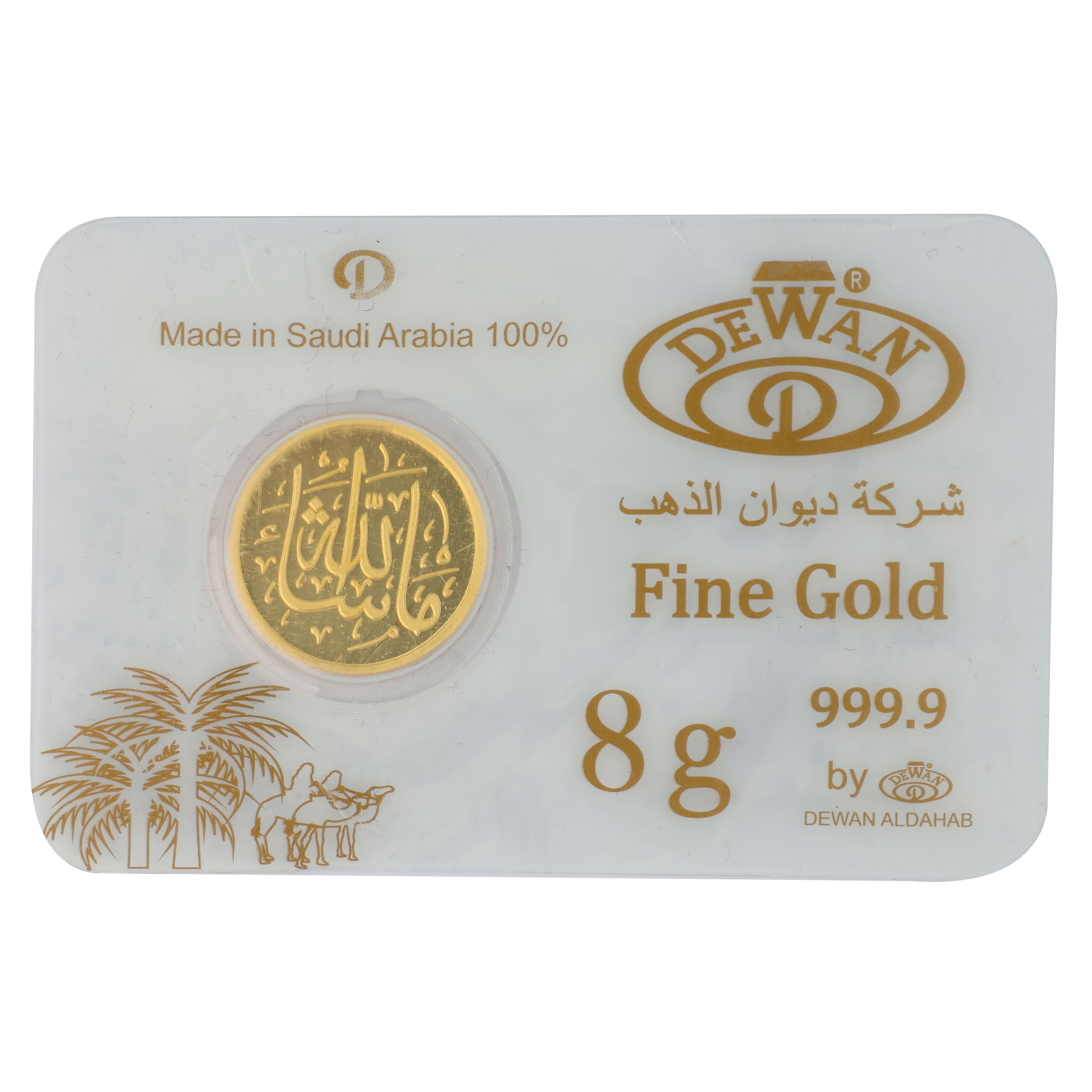 گولڈ دیوان سے سعودی گولڈ پاونڈ 8 گرام وزنی ، اور تحریر "ماشاء اللہ" کے ساتھ کندہ ہے، یہ آپ کے سرمائے کو بچانے اور محفوظ کرنے کا ایک زبردست اور پائیدار طریقہ سمجھا جاتا ہے ، اس کی اعلی پاکیزگی (999.9%) کی بدولت ۔ آپ زیادہ مالی منافع حاصل کرنے کے لیے اس میں سرمایہ کاری بھی کر سکتے ہیں۔ اس کے علاوہ، اس کے خوبصورت اسلامی ڈیزائن کی وجہ سے اسے ایک غیر معمولی تحفہ سمجھا جاتا ہے۔ 🌙✨
